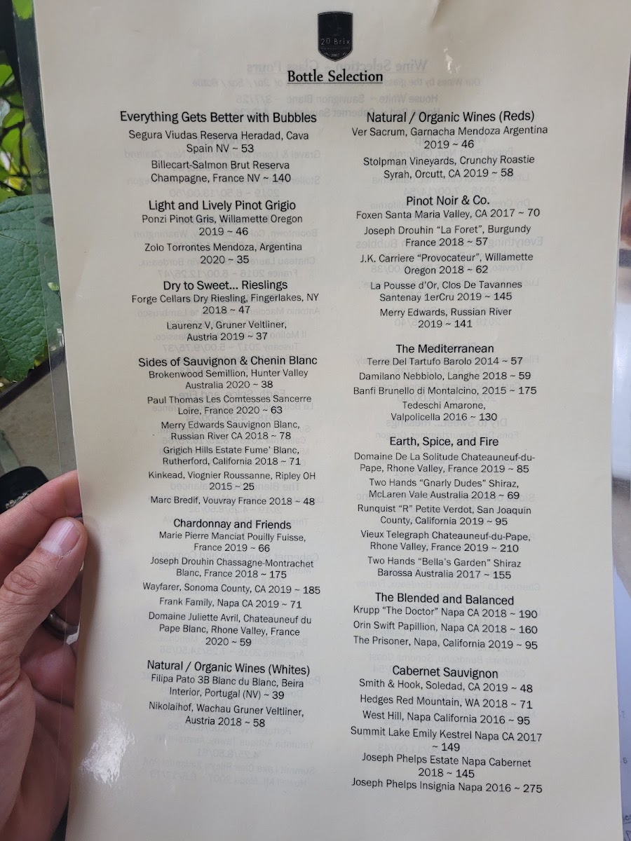 Don’t miss out on dessert—Chocolate Pot de Crème and Lemon Berry Mascarpone are both heavenly. With exceptional service, including a knowledgeable sommelier and staff that make every visit special, 20 Brix is a dining experience not to be missed.